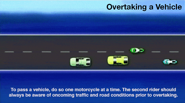 There will come a time when one must pass a vehicle traveling in the lane in front of them. To safely pass the vehicle, do so one motorcycle at a time. The leader will go first, but each rider successive will need to position their motorcycles in the left third of the lane before starting the overtaking maneuver.