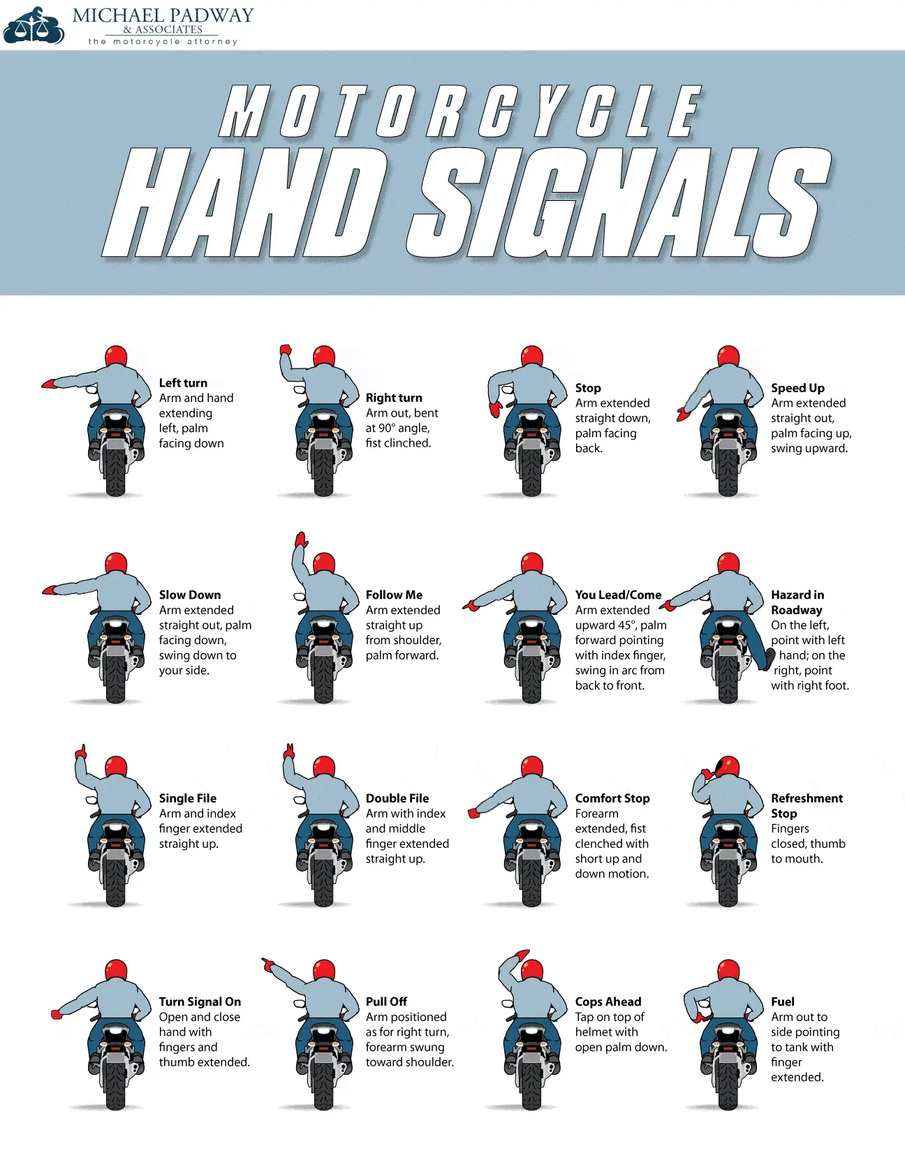 Note that these signals should be a quick discussion point and possibly a show and tell during the pre-ride meeting. Ensure all riders know the signals and their meanings.