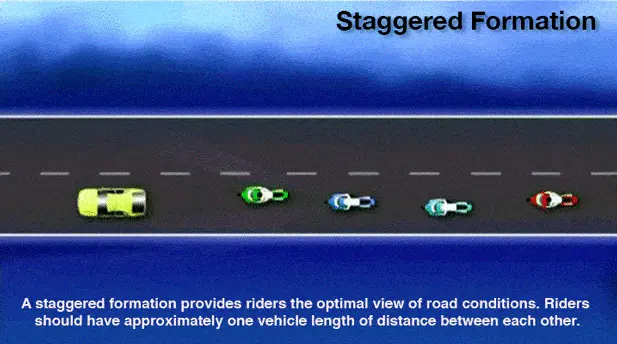 The next or second rider will ride approximately one second behind the leader and in the left half of the lane. The third rider continues the pattern by riding in the right half of the lane, one second behind the second rider and two seconds behind the leader. The riders behind that continue the pattern until the group is complete and staggered accordingly.